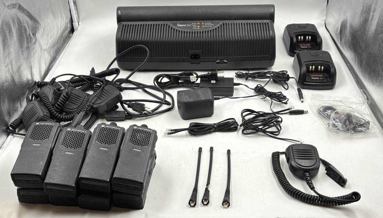 Lot Of 8 Motorola Aah45rdc9aa3an PR860 403-470mhz Two Way Radios W/ Batteries These items are used, one has broken knobs. Also includes 1x Wpln4197a Impres Six Bank Charger and other parts/accessories as shown.