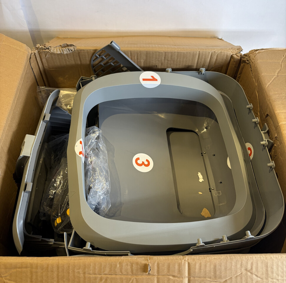 MIntakawa Self Cleaning Litter Box APP control and weight monitoring This item is new in a freight worn box as shown. Assembly required.