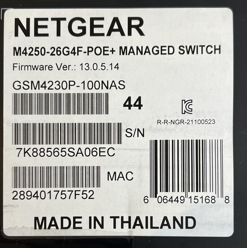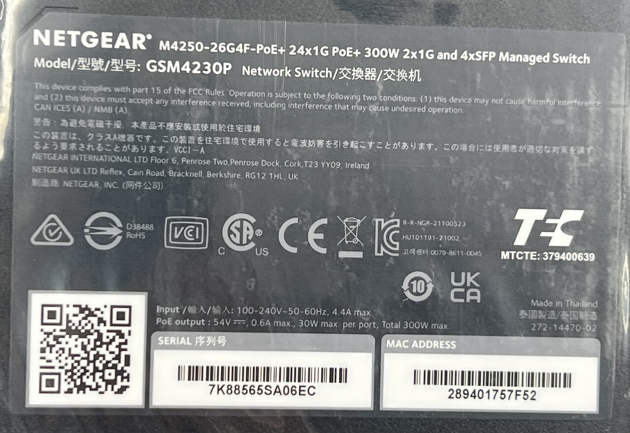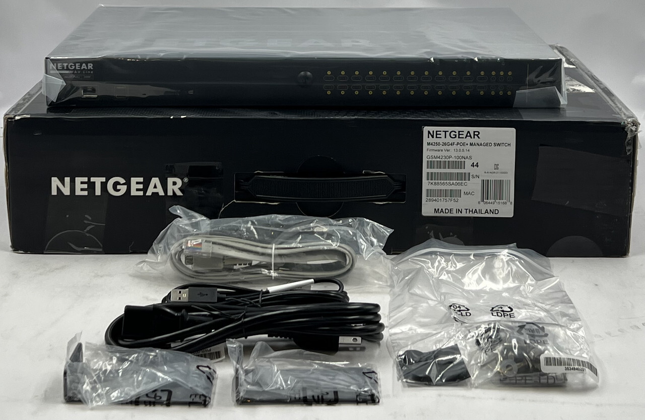 NETGEAR M4250-26G4F-PoE+ AV Line Managed Switch GSM4230P-100NAS This item is internally sealed in box as shown.