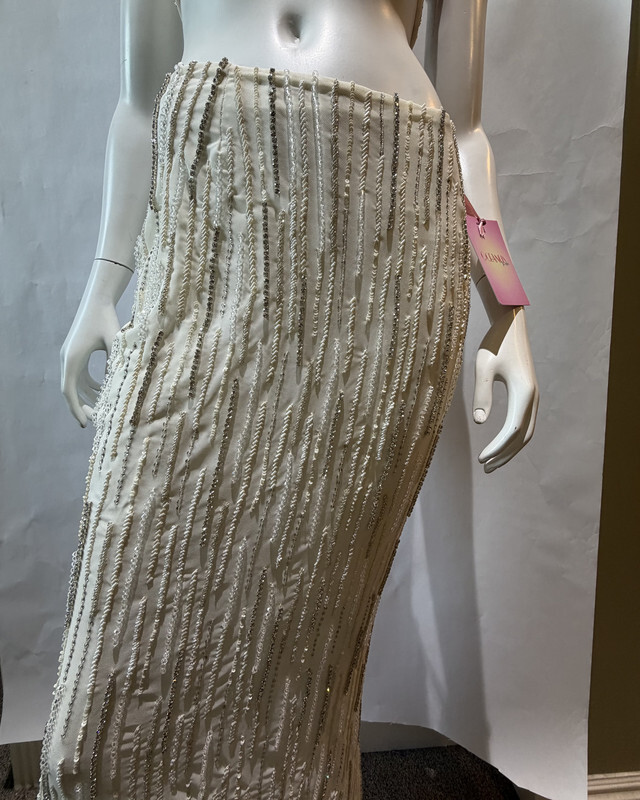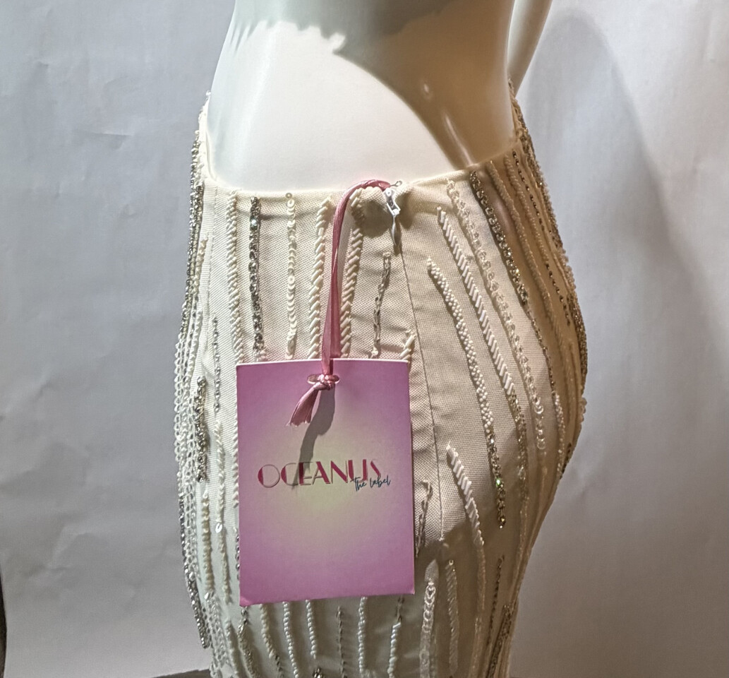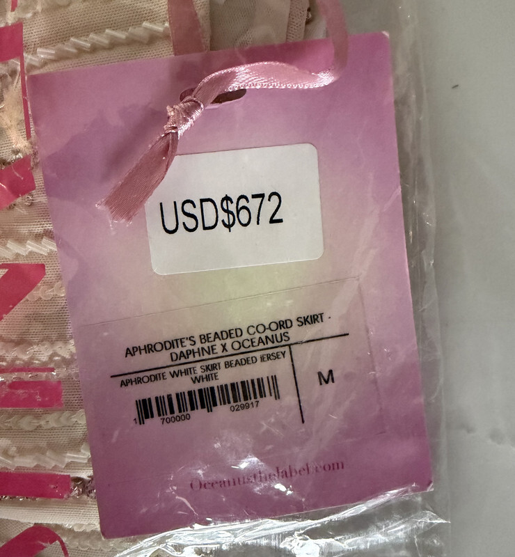 Oceanus X Daphne Aphrodite's White Co-ord SKIRT SIZE Medium Jersery White SD This skirt is brand new with original tags as shown. This skirt has small cosmetic stain or imperfection on bottom left side as picture.