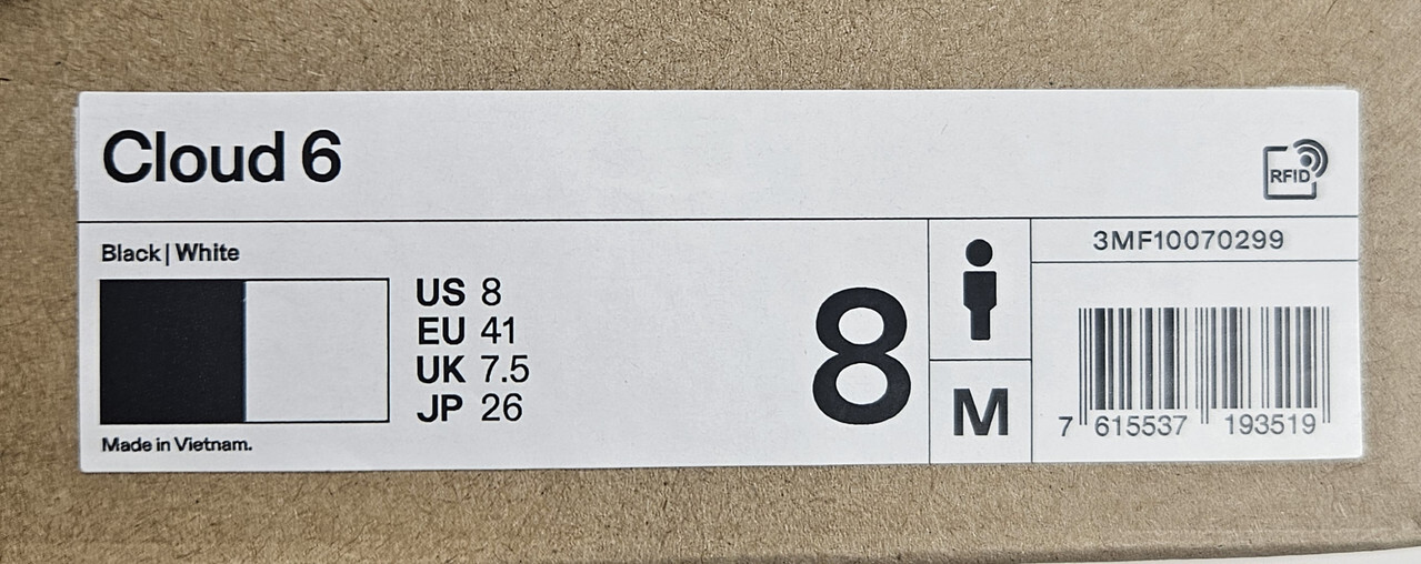 ON 3MF10070299 CLOUD 6 Black/White US 8 EU 41 This item is new as shown.