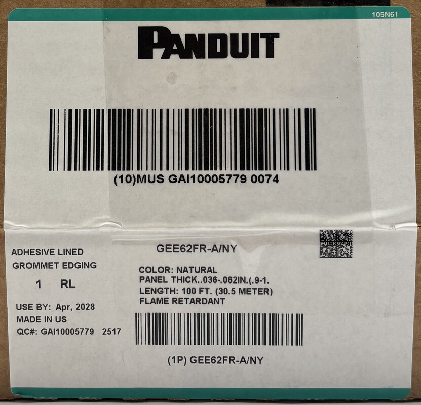 Panduit GEE62FR-A/NY 100 FT. Flame Retardant Adhesive Lined Grommet Edging This item is new and sealed as shown.
