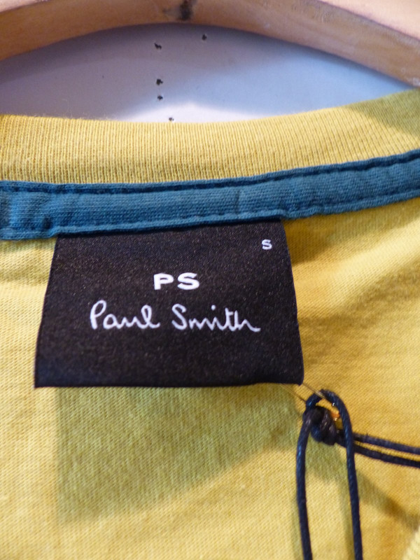 PAUL SMITH MENS REGULAR FIT TSHIRT YELLOW STIPES SIZE SMALL Approximate measurements laying flat: Arm pit to arm pit across chest - 20". Back length from collar seam to bottom hem - 28". This item is new as shown.