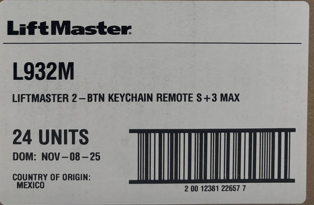 QTY 24 LiftMaster L932M 2 00 12381 22657 7 2-BTN Keychain Remote S+3 MAX These items are new and sealed in the original box as shown.