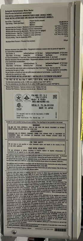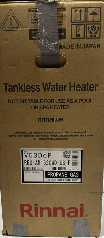RINNAI V53DEP PROPANE 120K BTU TANKLESS WATER HEATER REU-AM1620WD-US-P This item in new in an opened box as shown.