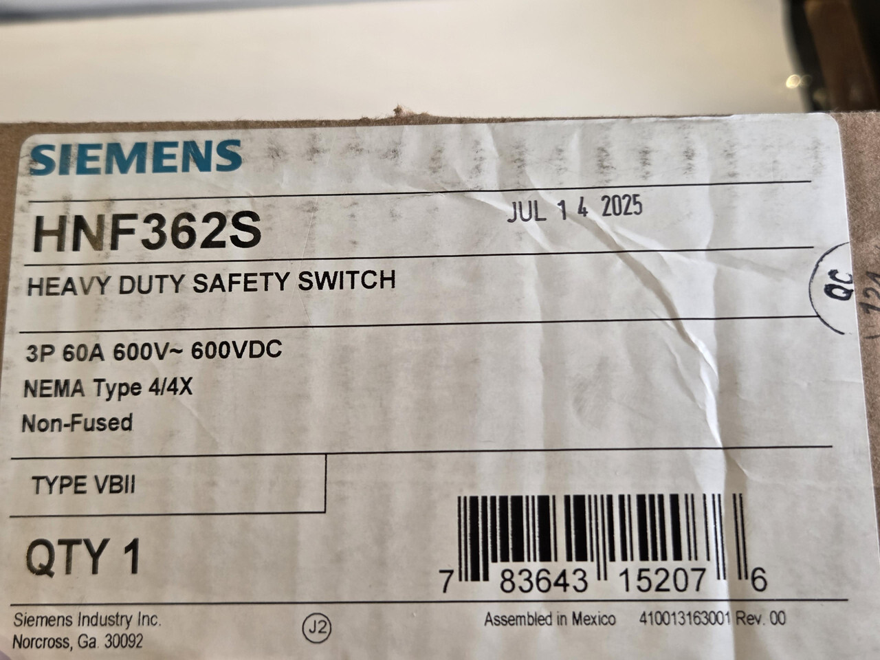 SIEMENS HNF362S NON FUSIBLE HEAVY DUTY SAFETY SWITCH 3P 60A 600V ~600VDC NEMA 4/4X This item is new as shown.