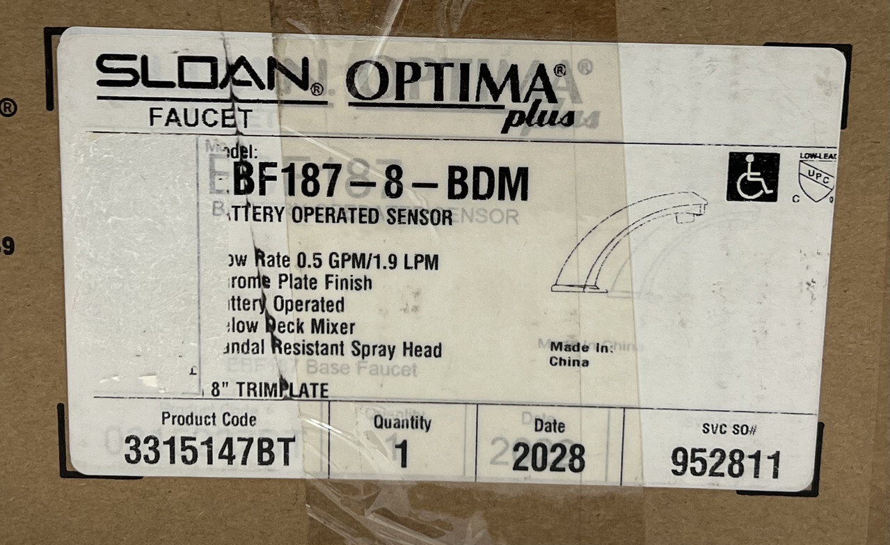 SLOAN OPTIMA PLUS EBF187-8-BDM BATTERY OPERATED SENSORED FAUCET CHROME 3315147BT This item is new as shown.