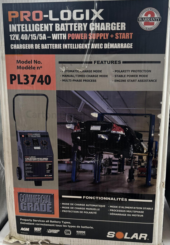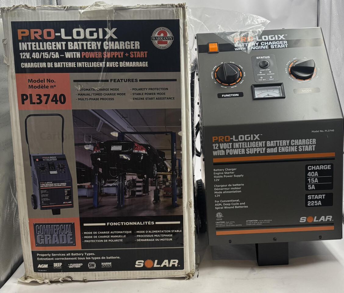 Solar Pro-Logix PL3740 Automotive Battery Charger With Wheels This item is new and comes in a freight worn box as shown.