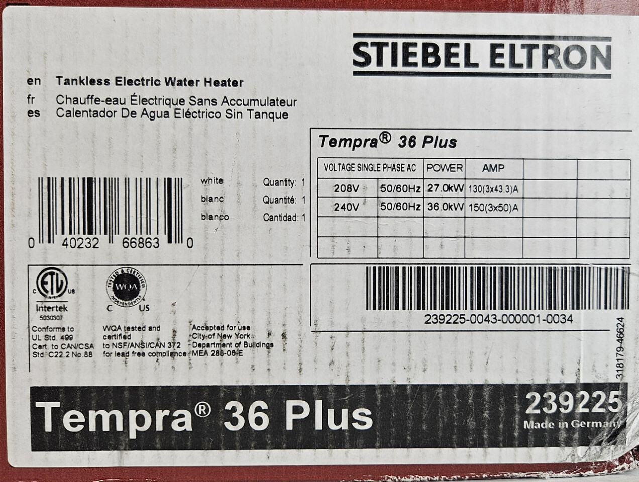 Stiebel Eltron 239225 Tempra 36 Plus Electric Tankless Water Heater This item is new in a sealed box as shown.