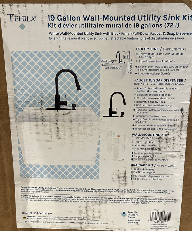 Tehila 2507Series 19 Gallon Wall-Mounted Ultility Sink Kit Black Finish Pull Down Faucet This item is sealed in an open box as shown