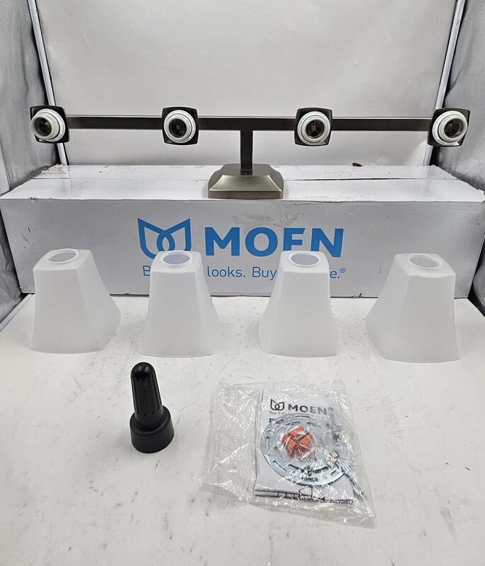 THE MOEN YB5164BN Voss 4-Globe Bath Light (Brushed Nickel) This item is new and comes with accessories in a damage box as shown.