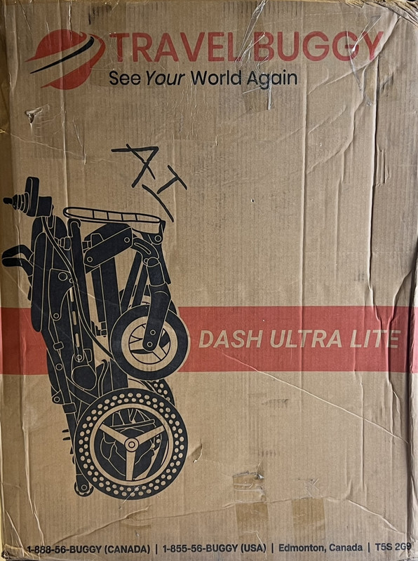 TRAVEL BUGGY DASH ULTRA LITE FOLDING POWER WHEELCHAIR IN BLACK This item is brand new and comes in an opened manufacturer box as shown.
