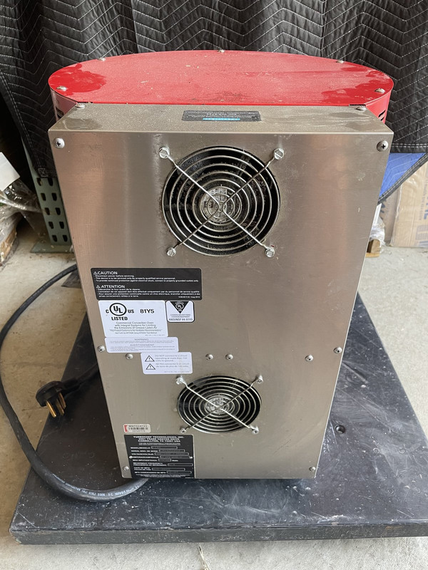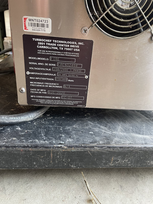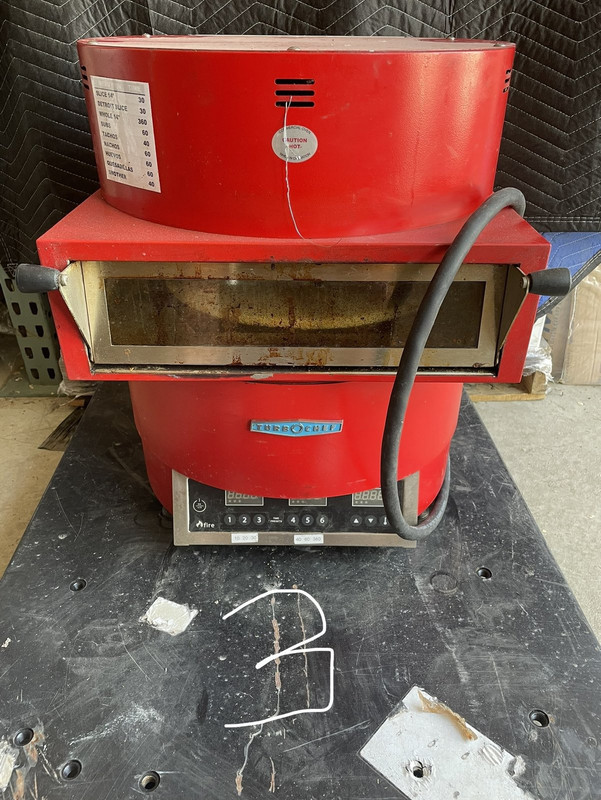 TURBOCHEF FIRE RED COUNTERTOP PIZZA OVEN VENTLESS OPERATION W/ OVEN STONE This item comes as shown in the images. It is in good working condition with oven control button wear without affect to the operation of the oven. It includes 4 feet knobs, 2 thumb screws, a power cord, and comes with a pizza stone. the manufacturer date is 08/2020