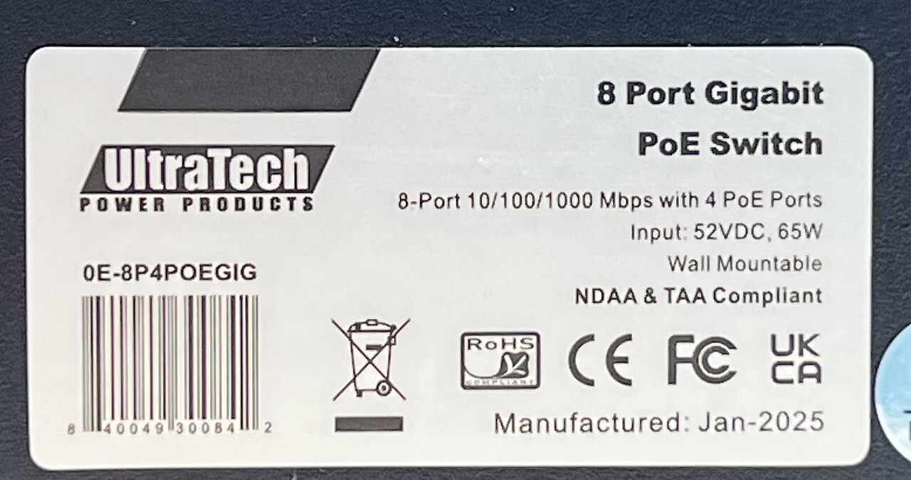 UltraTech 8-Port Gigabit Ethernet PoE switch with 4 PoE ports 0E-8P4POEGIG This item is new as shown.