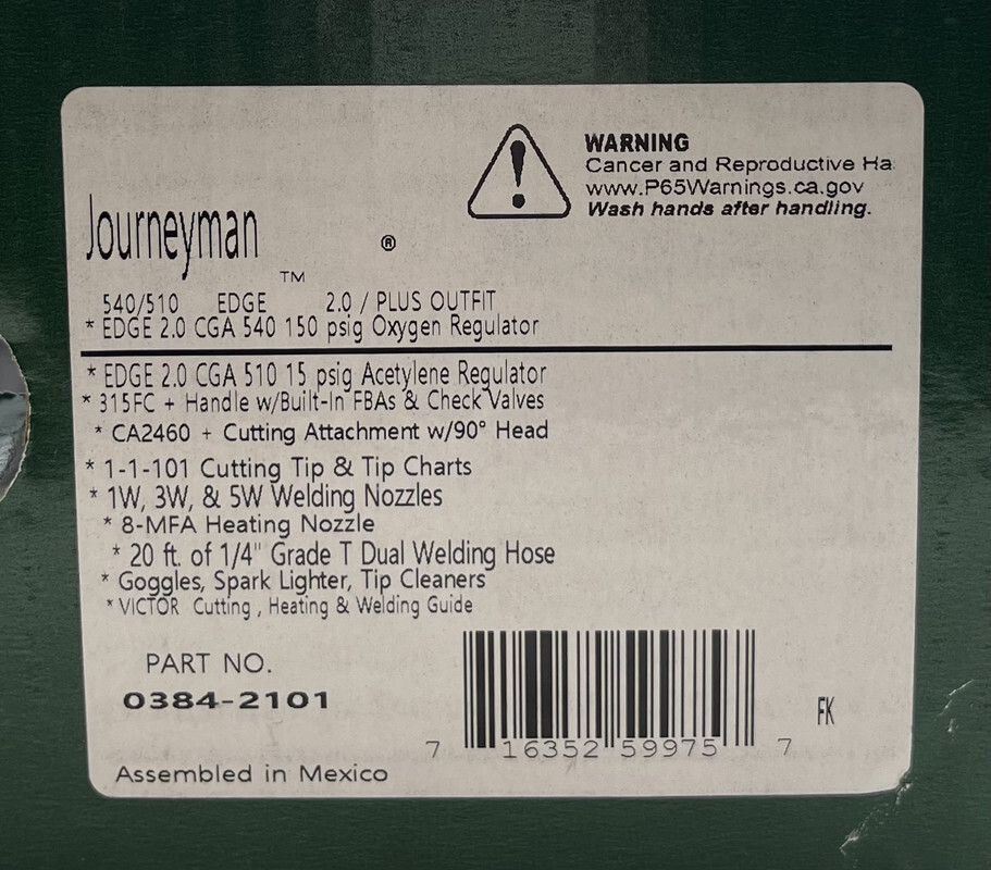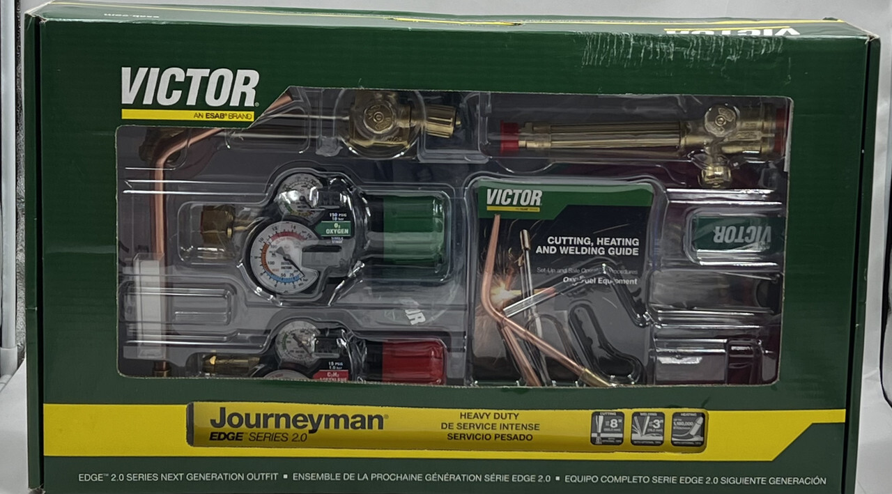 VICTOR JOURNEYMAN 0384-2101 Torch Kit w/ Regulators Edge 2.0 Series Heavyduty This item is brand new in a freight worn sealed box as shown.