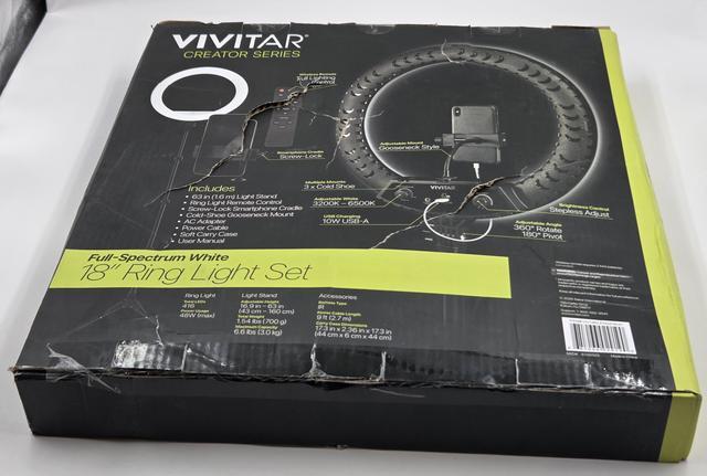 VIVITAR 18" LED Ring Light Set White 36" Tripod Stand Carrying Case and Mount This Item is new in a freightworn box as shown