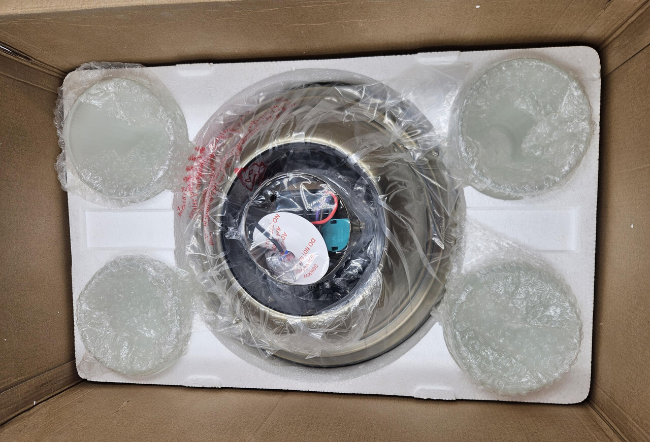 - Notes: This item is brand new, includes (4) 4.5W LED candelabra base light bulbs with reversible blades oak/walnut, and is internally sealed in an open box as shown.