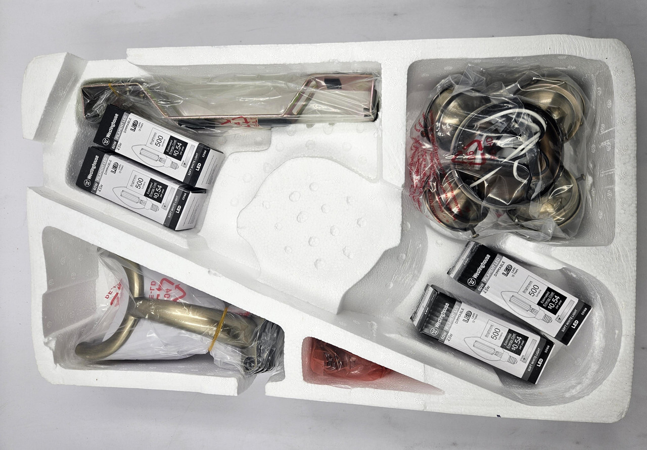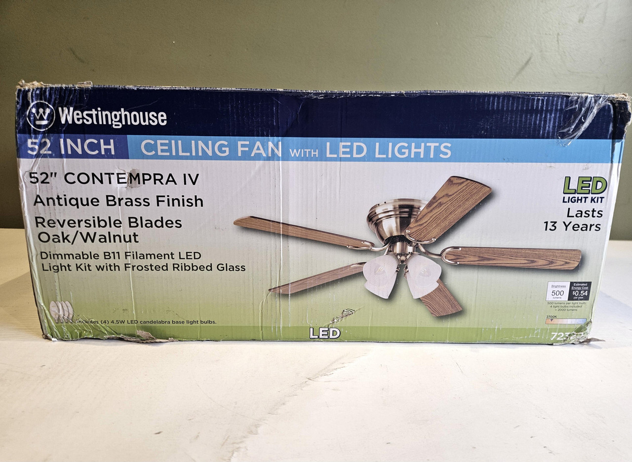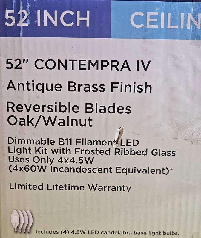 Westinghouse 72322 Contempra IV Brass LED Indoor Ceiling Fan 52" This item is brand new, includes (4) 4.5W LED candelabra base light bulbs with reversible blades oak/walnut, and is internally sealed in an open box as shown.